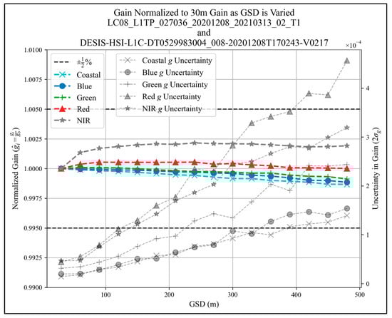 Parametric trades with varying GSD showed only minor influences (<0.25%) in resulting gain and, while moderate, showed increased uncertainty in gain with an increased GSD due to a smaller number of spatial samples. Uncertainty in gain increased approximately ten-fold to a maximum of nearly 5 × 10−4 in the red band for one scene.