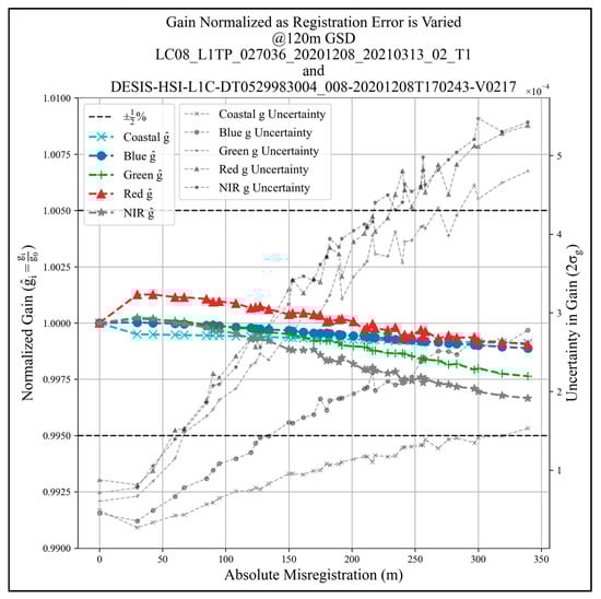 To evaluate the effect of misregistration on cross-calibration results (gain), L8 and DESIS-simulated L8 image pairs were parametrically misregistered in both the row and column direction. The image pairs that were used had a 120 m GSD and were initially co-registered. Missregistrations varied up to 240 m (2 pixels) in both the row and column direction for a total misregistration of ~339 m. Figure 18 shows the influence of misregistration for the same Oklahoma cross-calibration site (L8 P27/R36 and DESIS Tile 8) discussed above. In the misregistration range investigated, normalized gain, or the gain achieved at a particular misregistration with respect to the gain achieved using co-registered image pairs is less than 0.25%. While the uncertainty in gain (2σ) increases with increasing misregistration, it does not exceed 0.06%.