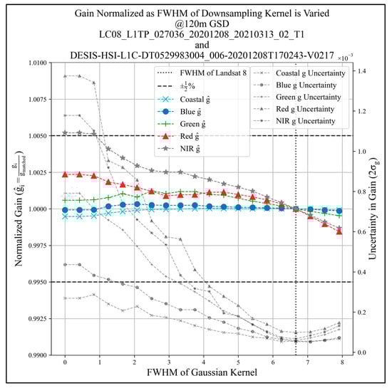 To evaluate the effect of PSF (image blur) on cross-calibration results (gain), a Gaussian kernel with a varying FWHM was applied to both the L8 and DESIS-simulated L8 image pairs. The image pairs that were used had a 120 m GSD. A baseline image blur was established by applying a Gaussian kernel with a FWHM equal to that of Landsat 8 to both images. FWHM values ranged from 0 to a maximum of 8. Figure 19 shows the influence of image blur for the same Oklahoma cross-calibration site (L8 P27/R36 and DESIS Tile 8) discussed above. In the range investigated, normalized gain, or the gain achieved at a particular image blur with respect to the gain achieved using the baseline image blur, is <0.25%. While uncertainty in gain (2σ) increases with image sharpness, it does not exceed 0.14%.