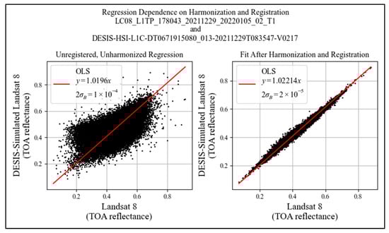 After the spectrally and spatially harmonized data from DESIS and L8 OLI are paired and co-registered, outliers, potentially due to misregistration and point spread function (PSF) matching errors, or as a result of resampling image pairs to each other, are avoided by applying a coefficient of variation (COV) threshold to blocks of pixels. The COV is calculated using 3 × 3 pixel regions. Regions with a COV less than 0.05 in both L8 OLI and DESIS-simulated L8 OLI data are identified as uniform regions and used for the assessment. These pixels are plotted against each other and regressed using an equally weighted ordinary least squares method to determine the quality of the fit, measured by its parameters, uncertainties, and coefficient of determination (R2).