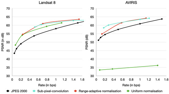 The capability of range-adaptive normalisation in removing the aforementioned artefact is evaluated using a factorised-prior model [4]. Figure 2 depicts the rate-distortion results comparing JPEG 2000, and [4] with uniform normalisation, sub-pixel convolution, and range-adaptive normalisation for Landsat 8 and AVIRIS images. Results indicate that range-adaptive normalisation performs on-par with sub-pixel convolution, especially in images such as AVIRIS, where ranges do not fully exploit the full dynamic range. Although sub-pixel convolution achieves good performance in lossy compression, it continues to produce the checkerboard artefact in low-variance bands—bands whose samples span a narrow range relative to the dynamic range—while the proposed range-adaptive normalisation variant does not, as Figure 3 shows. The number of bands with these characteristics depends on the sensor. For example, in AVIRIS data, there are around 50 or more such bands. Such bands can contain useful information, despite spanning a narrow section of the dynamic range, and due to their low variance, there is less tolerance to error in these samples.