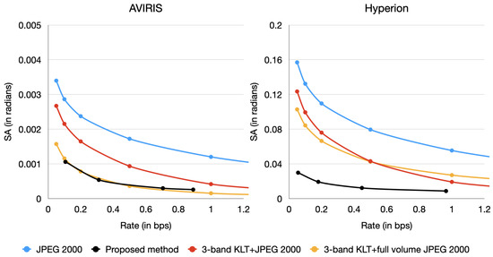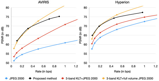 Figure 4 depicts the average compression Peak Signal-to-Noise Ratio (PSNR) results of full volumes in clusters of three bands for AVIRIS and Hyperion images. The vertical and horizontal axes provide the PSNR and the rate in bits per sample (bps), respectively. Similarly, Figure 5 depicts the average compression Relative Squared Error (RSE) results, which is another metric based on Mean Squared Error (MSE). The PSNR is calculated as , while the RSE is calculated as , where is the mean of the values in the image. These plots provide results for JPEG 2000, when the KLT is applied to clusters of three bands, and the transformed clusters are independently compressed with JPEG 2000 (3-band KLT + JPEG 2000) and, when the KLT is applied to clusters of three bands and the transformed, clusters are compressed with JPEG 2000 considering the whole volume (three-band KLT + Full volume JPEG 2000). For the proposed method, we set parameters and . The proposed method achieves competitive results compared to KLT + JPEG 2000 applied in clusters of three bands in both types of data, surpassing it by 9 dB PSNR on average in AVIRIS data and by 3 dB PSNR in Hyperion images. Furthermore, the proposed method can match the performance of three-band KLT + JPEG 2000 applied to the full volume.
