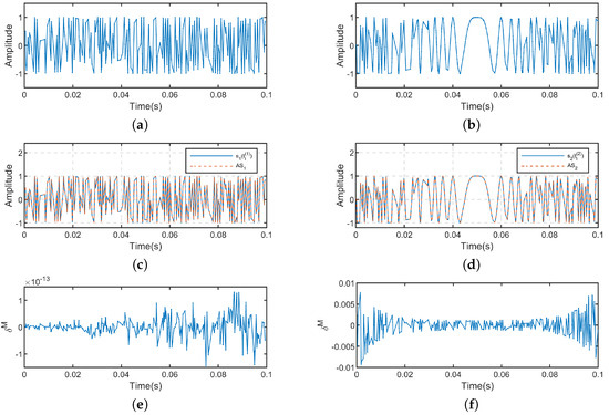 Since , we can solve it using (2). Let and be the discrete frequency spectrum vectors of and , and they have the same meaning as the variable S in Equation (2). The values of and are obtained by performing the fast Fourier transform (FFT) operation on the uniformly sampled signals of and , which are sampled at a rate ten times higher than the Nyquist sampling rate [24]. The A is generated based on the positions of the non-uniform sampling points. The waveform comparison between the non-uniformly sampled signals and obtained by multiplying A with the discrete frequency spectrum vectors are shown in Figure 1c,d. By subtracting the amplitudes of the two waveforms being compared, we can obtain of the two non-uniformly sampled signals, which are shown in Figure 1e,f, respectively. The simulation results indicate that compared to and , is significantly smaller. The ratio of in and is found to be and , respectively, satisfying the condition of . This also demonstrates that estimating the discrete frequency spectrum of non-uniformly sampled signals using (2) is feasible, as is significantly smaller compared to s.