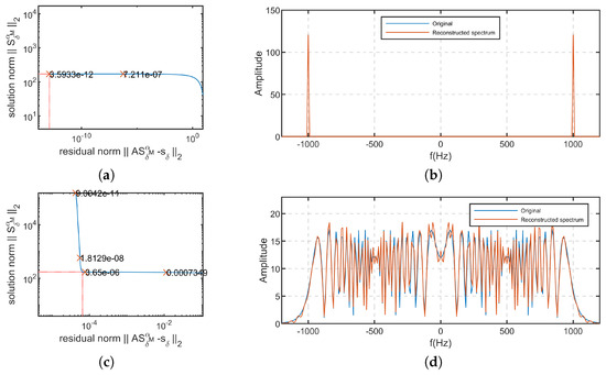 Considering that it is difficult to obtain prior knowledge about in practical non-uniform sampling problems, we adopt the L-curve criterion to select . The L-curve is used to describe the relationship between the residual term and the regularized solution under different . it can effectively utilize the information of and , seeking a balance that ensures both values are relatively small [28]. In order to avoid an excessively large regularized solution, we impose a constraint on the norm of within a certain range. In this case, we select the corner point of the L-curve, which corresponds to the regularization parameter value that maximizes the curvature of the L-curve on a log–log scale. Let and , then the chosen is determined to maximize the following curvature function within a specified range [29].