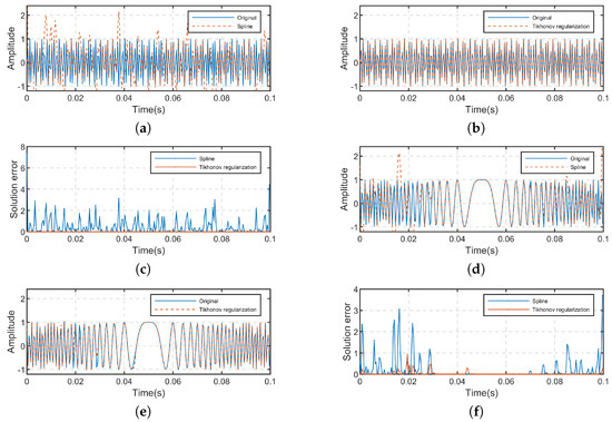 Reconstruction result of Spline interpolation for (a) and (b) . Reconstruction result of Tikhonov regularization for (c) and (d) . Comparison between the solution error of Spline interpolation and Tikhonov regularization for (e) and (f) .