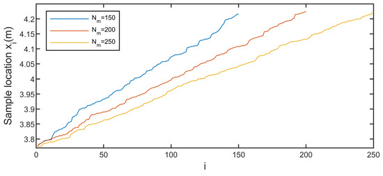 According to the antenna beamwidth, the radar is able to effectively receive the echo data of point target B within the azimuth position range of [3.7729 m, 4.2271 m]. We conducted a simulation by randomly sampling within this range, generating echo data corresponding to the positions obtained through random sampling. We selected three sets of non-uniformly sampled echo data. The value of for these three sets are 150, 200, and 250, respectively, approximately 1.2, 1.6, and 2 times the number of the azimuth wavenumber spectrum to be estimated. Figure 8 shows the sampling point positions for these three sets of echo data. The vertical axis represents the non-uniformly sampled positions in azimuth, and the horizontal axis represents the index i. A noticeable trend is that with a smaller value of , the interval between these points becomes relatively larger, leading to a more uneven distribution of the obtained echo data.