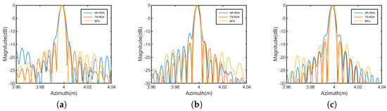 We compared the proposed algorithm (TR-RDA) with RDA, the Azimuth Resampling Algorithm (AR-RDA) based on spline interpolation and BPA. Figure 9 shows the imaging results for the three sets of echo data. For the convenience of comparison, the results were normalized and displayed in logarithmic form, with the image range set to be above −30 dB. When RDA is directly applied to the azimuth non-uniformly sampled echo data, the imaging results showed severe defocusing. The focusing effect of point targets obtained by AR-RDA deteriorates as the value of decreases due to the influence of spectral aliasing effects, while the TR-RDA and BPA algorithms exhibit relatively minor variations with changes in . Moreover, from the imaging results, it is evident that the TR-RDA algorithm yields superior focusing effects compared to the results obtained by AR-RDA and BPA.