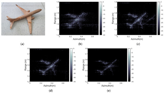 (a) airplane model optical image; (b) RDA; (c) AR-RDA; (d) TR-RDA; (e) BPA.