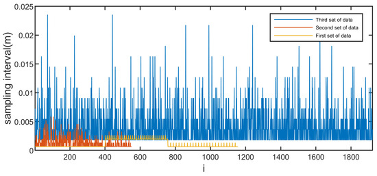 For these three sets of raw echo data, we selected values of 1156, 551, and 1922, respectively. Figure 15 shows the interval size between the non-uniformly sampled points for these three sets of data. The y-axis represents the interval between adjacent non-uniformly sampled positions, denoted as (), and the x-axis represents the index i. Since these three sets of echo data originate from the same THz radar system, the larger the non-uniform sampling interval, the more uneven the obtained non-uniform sampling data. The selected first set of data exhibits a relatively regular interval between the positions of the sampled points, and it has the smallest non-uniform sampling interval. The second and third sets of data were obtained using random sampling, but the third set is based on sparser raw echo data, resulting in larger non-uniform sampling intervals compared to the other two sets of data.