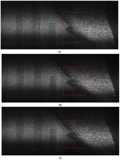 For the proposed algorithm, the wavenumber spectrum interval , and the model parameters are calculated as shown in Table 5. Figure 12, Figure 13 and Figure 16 show the imaging results for these three sets of non-uniformly sampled data. In Figure 16, the regions where substantial differences exist among the three algorithms are marked by red boxes. We evaluate the imaging quality using image entropy, and the results are presented in Table 6. The experimental results indicate that, compared to the other three non-uniform sampling image reconstruction algorithms, the image focusing effect obtained by using the traditional RDA algorithm to process the non-uniform sampling echo data is poor. As shown in Figure 12c–e, all three algorithms yield satisfactory imaging results for the first set of data with denser sampling points. However, for the other two sets of data with larger non-uniform sampling intervals, AR-RDA does not yield satisfactory results, as evident from the noticeable blurring in Figure 13c and Figure 16a. Furthermore, within the red box region on the right side of Figure 16c, the imaging results of BPA exhibit certain geometry distortions as a result of the non-uniformity of the sampling positions.