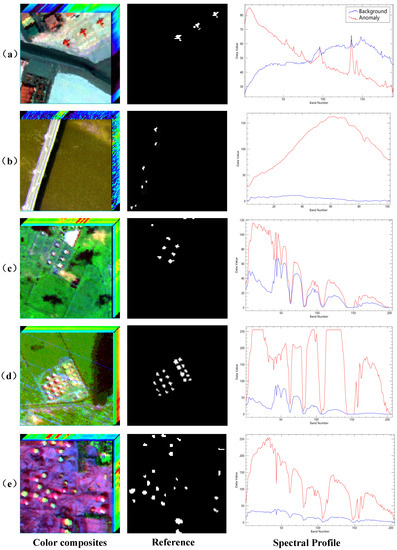 (5) Los Angeles: This dataset originated from the 7.1 m spatially resolved AVIRIS sensor. After bands selection, this photographic scene, which has a 100 × 100 pixels area, contains 205 spectral bands with wavelengths ranging from 400 to 2500 nm, and 272 pixels representing oil tanks are classified as anomalies. Figure 2e displays the color composites, reference, and spectral profile of anomalies and background, respectively.