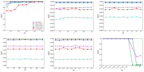 (2) Coefficient for the dimensionality of hidden layer r: As shown in Figure 3, to reduce the dimension, the ratio for all datasets varies from 0.1 to 1 with 0.1 intervals. During training, m is set as summarized above, N is 11, H is 300, and are both for all datasets. For a small value of r, the AE is incapable of achieving the best representation for the feature, while a large r may lead to overfitting, which results in the decreasing of AUC. Overall, increasing the hidden layer dimension of a neural network can limitedly improve the scores of AUC. In case of the same performance, it is prone to the smaller value, which can avoid overfitting. The optimal values of r are selected to be {} for San Diego, Pavia Center, Texas Coast-1, Texas Coast-2, and Los Angeles, respectively.