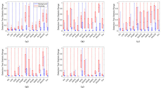 The box and whisker diagrams of the background-anomalies separability of different method comparisons for the five real datasets: (a) San Diego, (b) Pavia Center, (c) Texas Coast-1, (d) Texas Coast-2, (e), and Los Angeles. The red boxes are the detection test statistic range of anomalies, while the blue boxes denote the detection test statistic range of background.