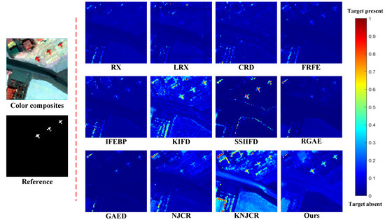 As shown in Figure 5 and Table 4, the FRFE has the best score of AUC, which is .The RX and the proposed have the second and third highest scores of AUC which are and , respectively. All comparison methods can achieve higher scores than for AUC. As for the visual comparison demonstrated in Figure 8, the performance of KIFD and KNJCR is seriously disturbed. The RX, CRD, FRFE, IFEBP, and SSIIFD generate the detection map with substantial strip noise, which means these methods have a limited capacity to suppress noise. Although the MPGAE is robust to the substantial strip noise and locates automobiles and human-made targets clearly, it fails to filter pixels of the other building. At the same time, RGAE suffers from the same issues with more serious distractions whose wrong predictions are brighter. In Figure 4b, in contrast to other methods, the proposed MPGAE is able to suppress the background with a clear separation degree.
