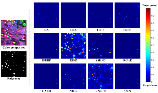 Similar to the comparative result of the other datasets, the proposed MPGAE realizes the highest AUC whose score is in Los Angeles. The RGAE and KNJCR have the second- and third-highest scores of AUC which are and , respectively. The color detection map of NJCR shows the shapes of oil tanks and partial backgrounds. In Figure 10, The KIFD highlights the oil and partial background at the same time which makes it hard to locate targets. In addition, the detection results of the KIFD contain a lot of noise. Although the probability values of anomalies are low in the color detection map of MPGAE, it is still much higher than the background which makes the abnormal pixels able to be identified. As for the analysis of the separation degree and suppression in Figure 4e, the proposed method can effectively suppress background with a smaller range than SSIIFD. And the CRD cannot diagnose the targets from the boxes.