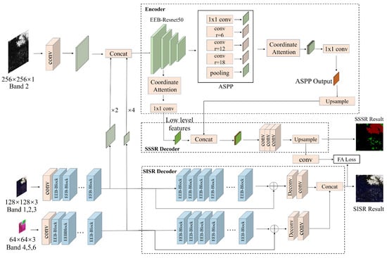 Aiming at the above problems, this paper combines super-resolution with semantic segmentation and proposes an end-to-end super-resolution semantic segmentation method, which, on the one hand, incorporates a super-resolution decoder branch into the network to enable the network to utilize super-resolution branching information containing rich structural information to guide high-resolution segmentation mapping. On the other hand, the edge enhancement module and the improved attention mechanism are used to improve cloud–snow classification performance and the edge segmentation effect and to obtain high-spatial-resolution cloud–snow segmentation results. Specifically, the main innovations of this paper are as follows: (1) We propose an end-to-end super-resolution and semantic segmentation network to improve the spatial resolution of FY-4A/AGRI data in the near-infrared (NIR) and short-wave-infrared (SWIR) bands and obtain high-resolution cloud–snow segmentation results. (2) We design residual structures containing edge enhancement blocks (EEB) to extract fine edge information. (3) We propose an improved coordinate attention module (CA) to enhance contextual connectivity and reduce the impact of irrelevant features on segmentation accuracy.