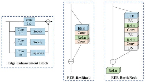Due to the difficulty of learning fine image structures, this paper is inspired by the edge-oriented convolution block (ECB) method [30] and improves it for the cloud–snow segmentation task, which was finally named the edge enhancement block (EEB). This module contains a basic 3 × 3 convolution and uses a pre-defined Sobel filter in the horizontal and vertical directions and a Laplacian filter to extract edge information. The computations of the EEB module and the output are shown in Equations (1) and (2). The structures of the EEB, EEB-ResBlock with added edge enhancement module, and EEB-BottleNeck are illustrated in Figure 2.