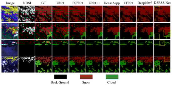 The experimental results show that DSRSS-Net obtains high-accuracy 500 m cloud–snow discrimination results, and the improved CA module substantially alleviates the problem of cloud–snow misclassification. In addition, the addition of the edge enhancement module enables DSRSS to obtain more accurate edges in segmentation and also improves its sensitivity to small snow patches and continuous snow blocks. DSRSS-Net outperforms other classical segmentation networks in terms of all evaluation metrics. Compared with MOD10A1, DSRSS-Net improves snow classification accuracy and average total accuracy by 4.45% and 5.1%, respectively.