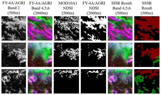 As shown in Figure 5, we compared the extraction of FY-4A/AGRI snow data using the NDSI MOD10A1 snow product and the output of the super-resolution branch and semantic segmentation branch of the DSRSS-Net. It can be seen that the NDSI method is not sensitive to small snow spots or continuous snow blocks and lacks a large amount of snow recognition compared with the MOD10A1 snow product. The NDSI method only uses visible light and near-infrared bands for snow recognition, which is limited by the resolution of the 2000 m near-infrared band.