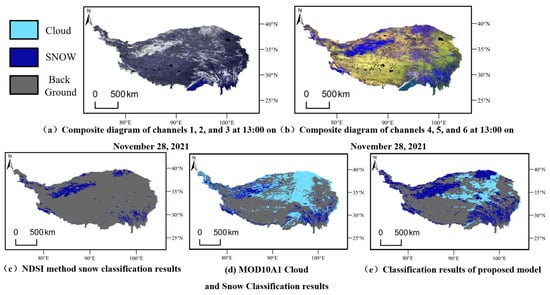 Comparison of mappings of snow accumulation on the Qinghai–Tibet Plateau at 13:00 GMT on 28 November 2021: (a) is a composite image of the FY-4A 500 m resolution output from bands 1, 2, and 3 from the super-resolution branch; (b) is composite image of the FY-4A 500 m resolution output from bands 4, 5, and 6 from the super-resolution branch; (c) is FY-4A 500 m resolution imagery extracted using NDSI; (d) is the result of cloud and snow classification with MOD10A1 at a 500 m resolution; and (e) is the result of cloud and snow classification for the proposed model at 500 m resolution.