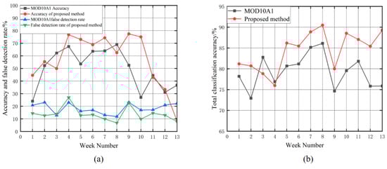Detection rate comparison for snow classification from January to March 2020. Figure (a) shows the accuracy and false detection rate of the proposed model and the MOD10A1 snow product. Figure (b) shows the total classification accuracy of the proposed model and the MOD10A1 snow product.