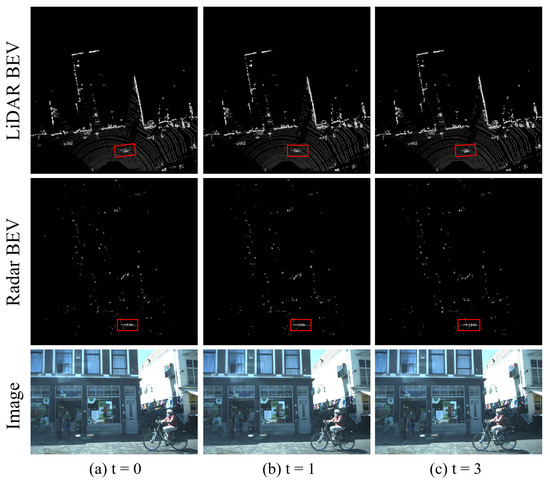 The outcome of converting the point cloud from LiDAR, mmWave radar into bird’s-eye view (BEV) is depicted. The red box highlights a pedestrian riding a bicycle, clearly illustrating the movement process. Compared to LiDAR, the mmWave radar is significantly sparser, resulting in limited available information.
