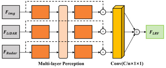 By utilizing multiple independent MLP blocks, the features extracted from images, LiDAR, and mmWave radar data from various frames are individually processed, resulting in the generation of . Subsequently, a concatenation operation is employed to merge the feature maps of all modalities from different frames, resulting in the creation of a fusion feature denoted as , formulated as: