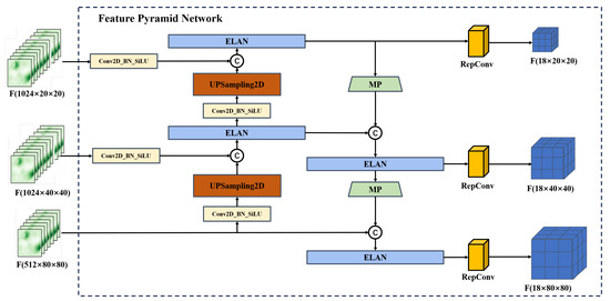 A feature pyramid network (FPN) is an enhanced feature extraction network, where the attention-enhanced features are then exploited at different scales for object estimation. It uses the Panet structure [20], which combines upsampling and downsampling to achieve multi-scale feature fusion. As shown in Figure 7, after the fusion of two backbones, we adopt the FPN feature pyramid to improve both accuracy and speed. It replaces the feature extractor in models like Faster R-CNN [13] and generates a higher-quality feature map pyramid. After a series of convolutions, we obtain the feature map. Through upsampling and progressively reducing the size, we preserve the high-level semantic information while increasing the size of the feature map. Then, we use the larger-sized feature map to detect small objects, thus addressing the challenge of detecting small objects.