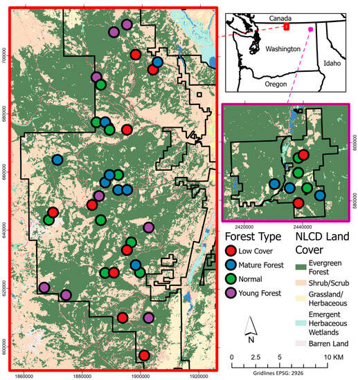 This study was conducted primarily in the Loomis State Forest with additional study sites in the nearby Little Pend Oreille State Forest in north-central Washington State, USA (Figure 1). Both forests are managed by the WA DNR. The Loomis State Forest occupies just over 54,000 hectares in northern Washington with the northernmost boundary abutting the Canadian border. There are several vegetation zones within the Loomis forest, with the two most common zones being dominated by the Douglas fir (Pseudotsuga menziesii) and subalpine fir (Abies lasiocarpa) tree species [47]. The other vegetation zones are shrub steppe, ponderosa pine (Pines ponderosa), lodgepole pine (Pinus contorta), and alpine. The western side of Loomis tends to be higher in elevation and hence more heavily forested than the east side. Much of the forest within Loomis is fragmented due to logging activity and past fires. Active cattle grazing also occurs over a large percentage of the forest.