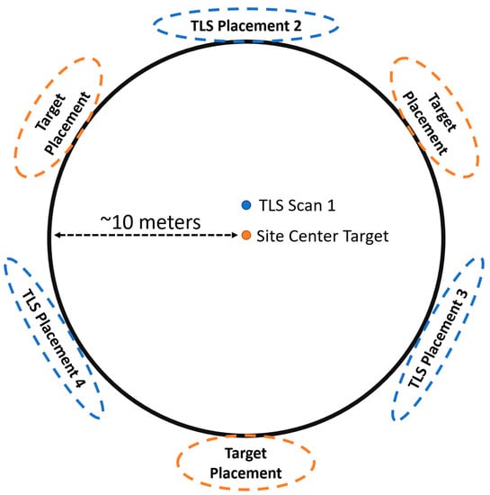 Scanning was performed between October 2021 and September 2022. Scanning was only performed in the summer and early fall. Each site had a center monumented for the RS-FRIS program. TLS scanning was performed with a central scan (scan 1) placed 1 m north of the monumented site center unless that location was heavily occluded by vegetation, in which case the location within 1 m of the site center with the best visibility was used. A TLS target sphere was placed at the site center with three other spheres placed at ~10 m distance from the center in the general directions of 60°, 180°, and 300° magnetic north. Scans 2, 3, and 4 had a generally similar distribution placed at ~10 m distance from the center in the general directions of 0°, 120°, and 240° magnetic north (Figure 2). Each scan location was considered a plot for the TLS metrics derived from a single scan. The edge scans and sphere placement had to have a significant amount of leniency in the actual location. If extremely dense vegetation or a large tree occupied the preferred location of placement, then the closest location to the preferred location that allowed for the surveying of the largest amount of the site was chosen. This scanning location selection criteria inevitably biased the scans against locations with near total occlusion, but that bias was deemed better than potentially missing as much as 50% of an area due to the scanner being placed directly next to a large tree.