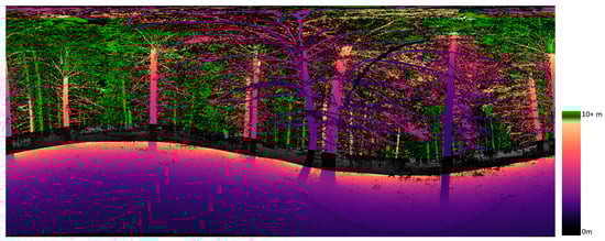 The DCB method is the process of determining, at a defined height increment of the plot, how far each pulse traveled before coming into contact with a surface (depth), as well as determining if a pulse interacted with a surface at all (openness) [45]. A 2D depth map of TLS scans can be created by generating a raster where each pixel represents a location where a laser pulse was sent. This is determined by the scan line resolution when the scan was taken. With a scan line resolution of 0.035° in both the vertical and horizontal axis of the scanner, the resulting raster will have ~10,286 columns (360°/0.035°) and ~4286 rows (150°/0.035°). Each pixel represents the distance traveled by the laser pulse at the angle increment, with a null value returned at locations where there was no pulse return (Figure 3). The value of each pixel is the distance from the scanner. A basic raster analysis can determine which pixels were within a set distance of the scanner, and which pixels exceeded that distance. In areas where there is a constant gradient of distances (i.e., line of sight not occluded by close vegetation), it is possible to identify the location on the horizon of the image a set distance away from the scanner (Figure 3).