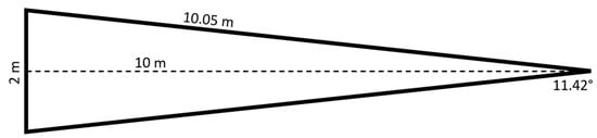 The dimensions of the view area of an object 2 m-tall and 10 m away from the TLS. The number of pixels within the depth raster representing 2 m is calculated by dividing the angular view (11.42°) by the scan angle increment (0.035°).
