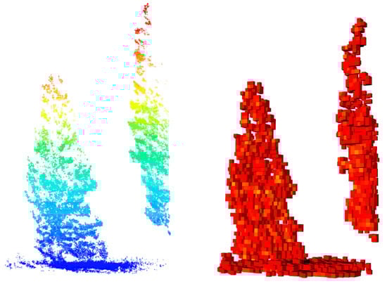 A voxelized and normalized TLS point cloud (left) with each point representing the centroid of a 10 cm cube. A voxel summary model (right) where each 0.5 m-resolution cube is colored by the number of occupied 10 cm voxels contained within it.