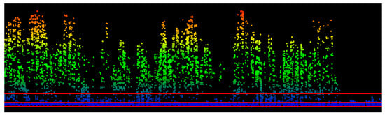 Normalized ALS point cloud with the ground, 0.5 m above the ground, and 2 m above the ground, denoted with red lines. These lines illustrate the subdivisions of the ALS point cloud that were used for ALS metric generation. First and last return sub-selections were also created for ALS metric generation.