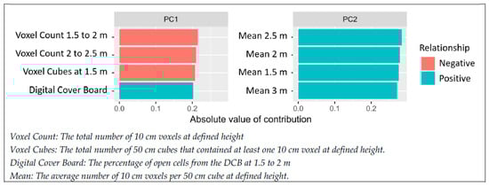 Of the 42 TLS metrics that were used for the PCA, the four metrics that most contributed to the principal component axis 1 were voxel count at 1.5 to 2 m, voxel count at 2 to 2.5 m, voxel cubes at 1.5 m, and the digital cover board. These four metrics will be referred to as “PC1 Metrics” hereinafter. The four metrics that most contributed to the principal component axis 2 were the means of the height strata of 2.5 m to 3 m, 2 m to 2.5 m, 1.5 to 2 m, and 3 m to 3.5 m (Figure 8 and Figure 9).