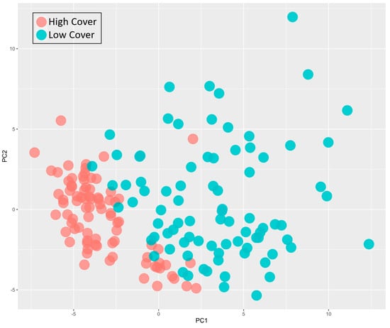 The PCA plot of the TLS metrics is presented in Figure 9. High-cover and low-cover classes were determined by using the DCB percentage metric with plots having more than 90% occluded cells counting as cover. There was an even split of plots that were high cover (80 plots) vs. low cover (80 plots) in our data.