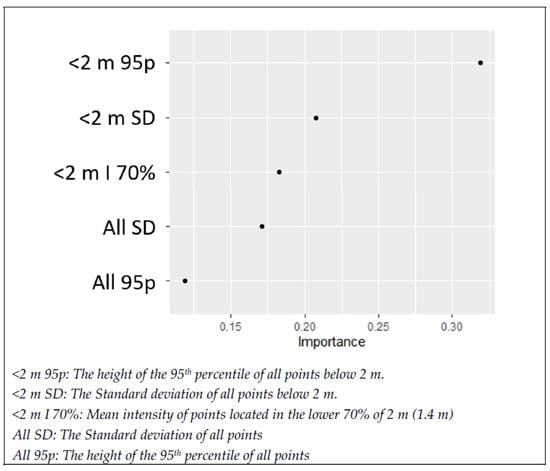 ALS area-based metrics typically look at the vertical arrangement of points within a defined plot size. Characterizing the vertical arrangement of points using simple metrics has been the subject of extensive research. The percentile heights of points is one of the most common metrics derived from lidar along with ratios of points below and above a defined threshold [17,65,66,67]. For our study, we derived 286 different metrics from ALS informed by reviewing methods used in previous forest structure research. We identified 5 metrics from the 286 that allowed for a high model fit using xgboost. Three of the five metrics used a subset of the point cloud of points below 2 m, while the other two metrics used all of the point returns. The 95th percentile height and the SD of points are lidar metrics that have been shown to be useful when modeling forest structural elements such as tree height, biomass, basal area, and quadratic mean diameter [68,69,70]. It is unsurprising that these metrics that are commonly used for modeling biomass are also useful when modeling horizontal cover. The combination of using these metrics from both the full point cloud as well as the points below 2 m may indicate that for future studies utilizing ALS for forest structure characterization, combining subsets of the data along with the full point cloud may provide more robust models. The fifth metric used was the mean intensity of points located in the lower 70% of 2 m (1.4 m). An important caveat when using intensity values from aerial lidar is that they are usually not calibrated to permit comparison between acquisitions [71,72]. Intensity values vary depending on the distance, angle, and surface that is reflecting the lidar pulse [73,74]. That different surfaces return different lidar intensity is likely the key to why it is an important predictor of understory vegetation conditions. If in the lower 1.4 m of a forest there is a lot of vegetation, then a different intensity value should be received than if there is a lack of vegetation and more visible soils or duff. When working within a single ALS acquisition, lidar intensity without calibration can still be effectively used to aid in differentiation between ground cover classes [75,76].