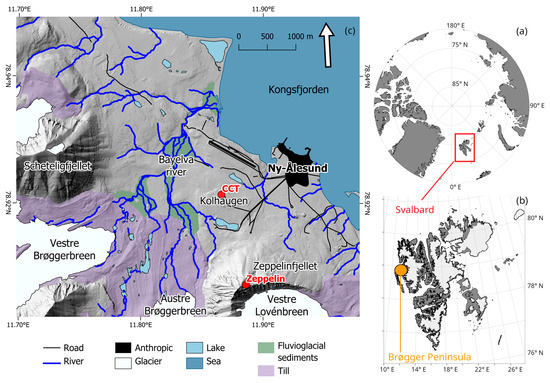Location map of Svalbard (a) and of the Brogger Peninsula (b). The study area with selected geographical features (c) combined with the position of automated stations (red dot), respectively the Amundsen-Nobile Climate Change Tower (CCT) and the Zeppelin Observatory. The base map features were obtained using data from [49].