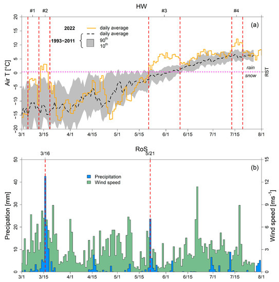 The March RoS was, therefore, characterized by cumulative liquid precipitation during the event above 70 mm with above-zero air temperature lasting for 96 h (Figure 4).