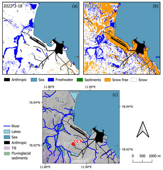 The hydrologic component of the water output (freshwater and water-saturated sediments) was 14–15% of the surface in late May–early June, which was then reduced to about 12% in late June. Although the snow-cover extent estimated using satellite data was consistent with the SCE calculated using the available time-lapse camera views, a shift was observed when limiting the analysis obtained by terrestrial photography to the footprint of sensors installed at the CCT. Considering the CCT sensors’ footprint with an extent limited to 20 m distance from the observation platform, the SCE timing of the completed snow melting period was coherent on 15 June. Results obtained by satellite and terrestrial platforms, in this case looking at the whole catchment from the Zeppelin observatory, depicted the snow-off 6 days later, on 21 June (Figure 7).