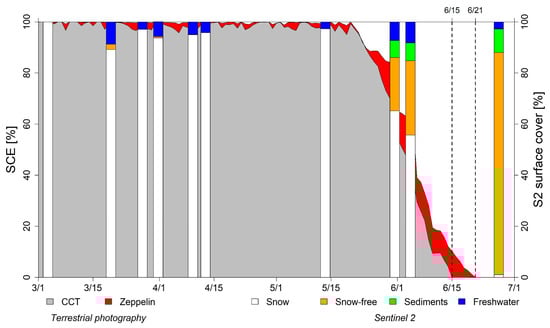Snow-cover extent and land-cover evolution of the area detected using terrestrial photography and Sentinel-2 data during the melting season.