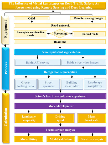 With the rapid growth of the global population and economy, urban road networks continue to expand, and the number of vehicles on the road is steadily increasing each year. As a consequence, traffic accidents are becoming more frequent. According to a report by the World Health Organization (WHO) in 2018, over 1.3 million people die in road traffic accidents every year. This leads to significant loss of life, property damage, and adverse environmental impacts, all of which are detrimental to the sustainable development [1,2]. During the process of driving on roads, the increasing frequency of traffic accidents caused by visual landscapes [3,4] necessitates the exploration of a new approach to integrate a large amount of data to represent the visual environment of drivers on the road and to investigate its impact on driving safety [5].