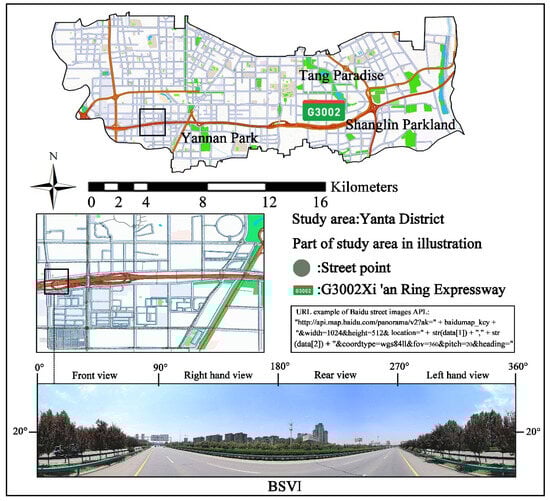 To comprehensively assess the environmental features of the Xi’an Ring Expressway, we retrieved Baidu Street View Images based on locations from the Baidu Map Open Platform and sampling points. First, the street network coordinate system downloaded from OSM (https://www.openstreetmap.org/, accessed on 20 April 2023) was calibrated. We randomly generated 1002 street-view sampling points at 50-m intervals, with latitude and longitude coordinates as the basis for input parameters in the Baidu Street View Map Application Programming Interface (API). Subsequently, to ensure a correct and complete view in all directions from each street-view point, a Python program was used to access the Baidu Map API and collect the panoramic images (Figure 3).