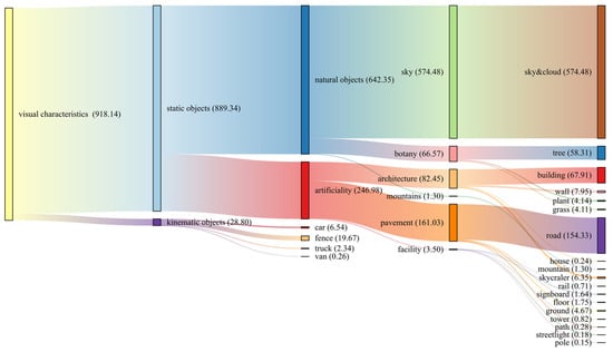 After analyzing the 990 BSVIs used in the case study, the coverage rate of 24 frequently occurring object categories was close to 92%. These categories can be considered fundamental visual elements that constitute the driver’s highway environmental landscape. The classification and proportions of visual elements are shown in Figure 6 and Figure 7. Within static and dynamic elements, there are both natural features and man-made structures. Sky, roads, buildings, and vegetation are the most common elements encountered by drivers while driving on a circumferential highway.