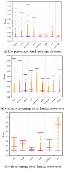 Figure 7. Distribution of visual landscape elements in Baidu Street View Images as a percentage of the score area.