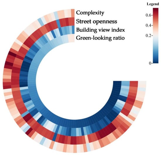 Figure 8. Heat map of green-looking ratio, street openness, building view index, and landscape complexity.