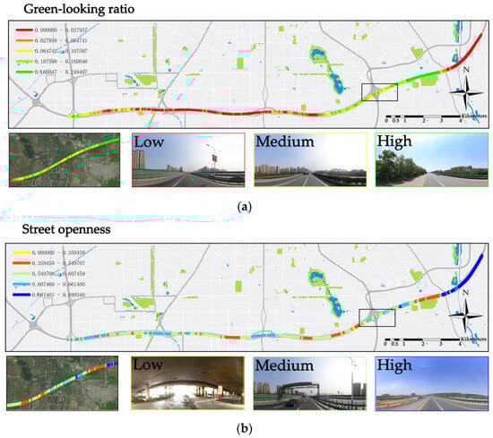 The spatial distribution of street openness showed an increasing trend with increasing distance from the city center (Figure 9b). Higher street openness values were primarily concentrated along the Chan River and Yanming Lake areas, which are typically linear waterfront areas and leisure parks with lower building density and wider visibility [67,68]. Notably, despite the relatively high green-looking ratio in the Qujiang Cultural Tourism and Residential Integration Zone, street openness was relatively low [69]. Previous studies have suggested that complex street trees can affect sky openness and decrease street openness, which is consistent with the findings of this study [22]. These findings highlight the influence of greenery on street openness and provide guidance for balancing greenery and visual openness in the planning of peripheral expressways. These findings highlight the influence of greenery on street openness and provide guidance for balancing greening and visual openness in the planning of the peripheral expressway.