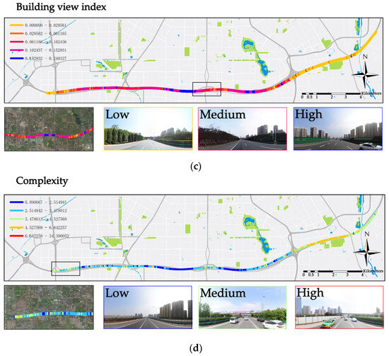 Figure 9d shows the distribution trend of landscape complexity, with lower values in the western region and higher values in the eastern region. This trend was generally opposite to the distribution trend for green-looking ratio but exhibits similar heterogeneity characteristics as street openness and building view index. This distribution pattern was influenced by factors such as billboards, signboards, and construction barriers, as observed in the analysis of street-view images. Additionally, the natural environment and population density influenced landscape complexity. Areas closer to urban rivers and lakes had higher landscape complexity [71], while areas near dense residential zones tended to have stable landscape complexities.