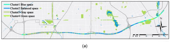 To investigate the spatial distribution patterns of the visual landscape elements along the ring road, a K-means cluster analysis was conducted on the green-looking ratio, street openness, building view index, and landscape complexity. According to the Elbow method [72], the appropriate number of clusters was determined to be 4. The analysis yielded four clusters representing areas dominated by high-complexity green spaces, low-complexity grey spaces dominated by buildings, medium-complexity blue spaces dominated by the sky, and balanced spaces with relatively even distributions of the three elements (Figure 10). The cluster centroids were as follows: 0.166, 0.009, 0.574, and 5.562 for green-dominated high-complexity spaces; 0.032, 0.135, 0.541, and 2.231 for building-dominated low-complexity spaces; 0.081, 0.027, 0.620, and 4.263 for sky-dominated medium-complexity spaces; and 0.057, 0.078, 0.589, and 3.134 for balanced spaces.