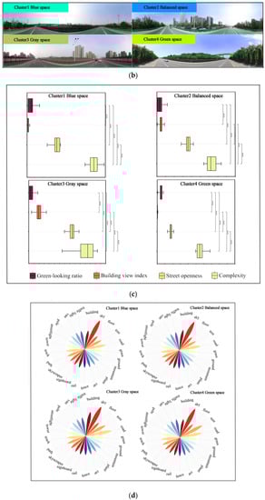 Figure 10. Cluster analysis results. (a) Cluster distribution results; (b) Examples of clustered street view images; (c) Box diagrams of 4 clusters; (d) Rose charts of 4 clusters. Notes: **** in (c) indicates a significant difference in the levels of visual landscape element indicators within the group.